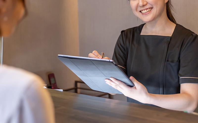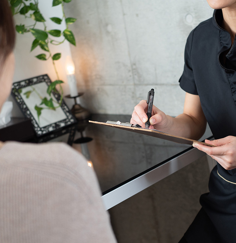 施術をお受けいただく前に、現在のお肌やお身体の状態を確認するためカウンセリングシートのご記入をお願いしております。お客様のお悩みや目的・体質に応じて最適なプランをご提案させていただき、本日行う施術内容、終了時間、金額をご案内いたします。